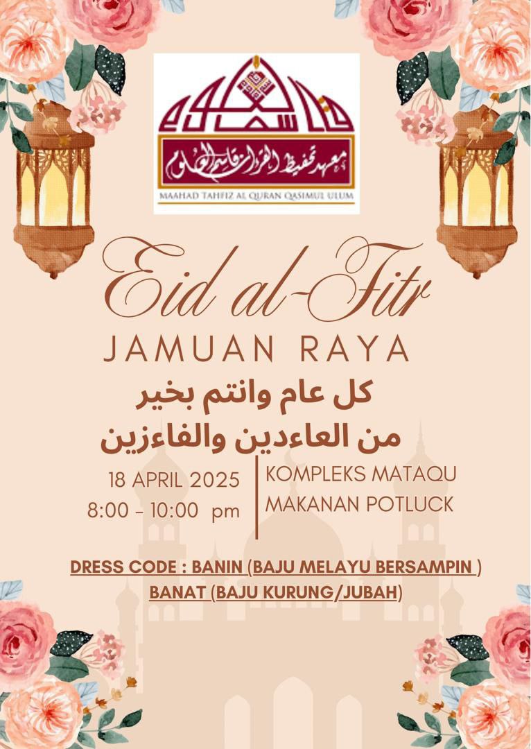 Pada 18 April 2025, warga menengah Maahad Tahfiz Al-Quran Qasimul Ulum (MATAQU) telah bersama-sama meraikan Jamuan Hari Raya Aidilfitri Peringkat Menengah dalam suasana yang cukup ceria, harmoni dan penuh kemesraan.